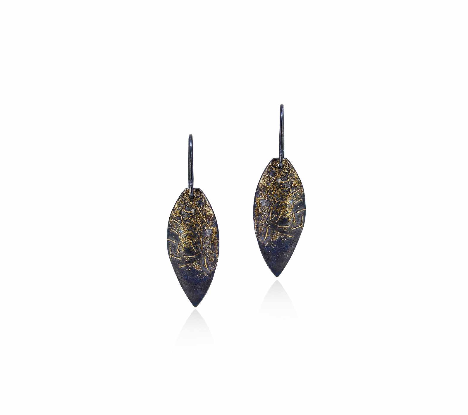 Oxidised sterling silver, 18ct yellow gold frosting hook earrings [10 x 28mm] [$POA]