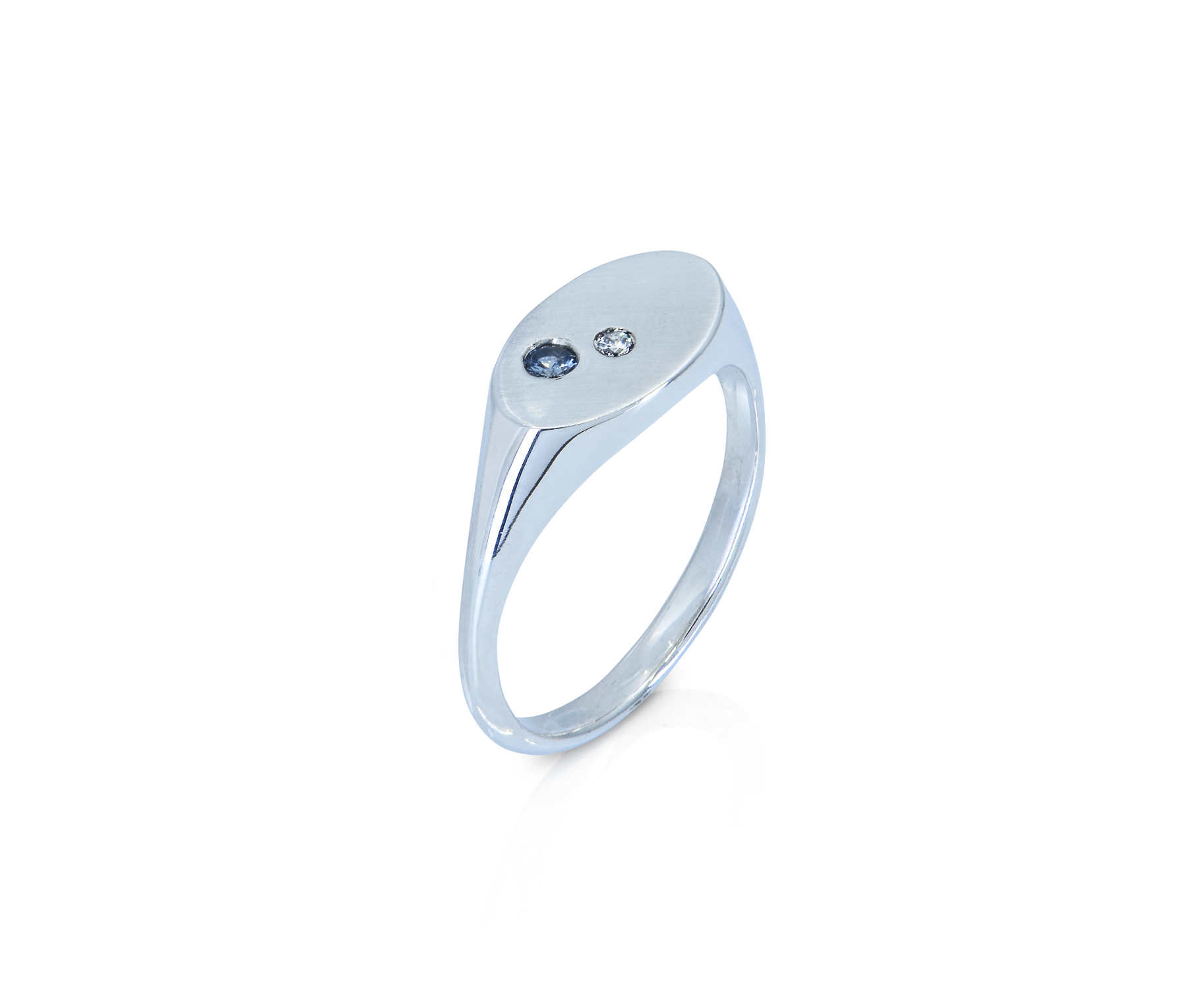 Recycled sterling silver, pale blue Ceylon Sapphire, Diamond signet ring [6.6 x 11mm, 2mm band] [$320]