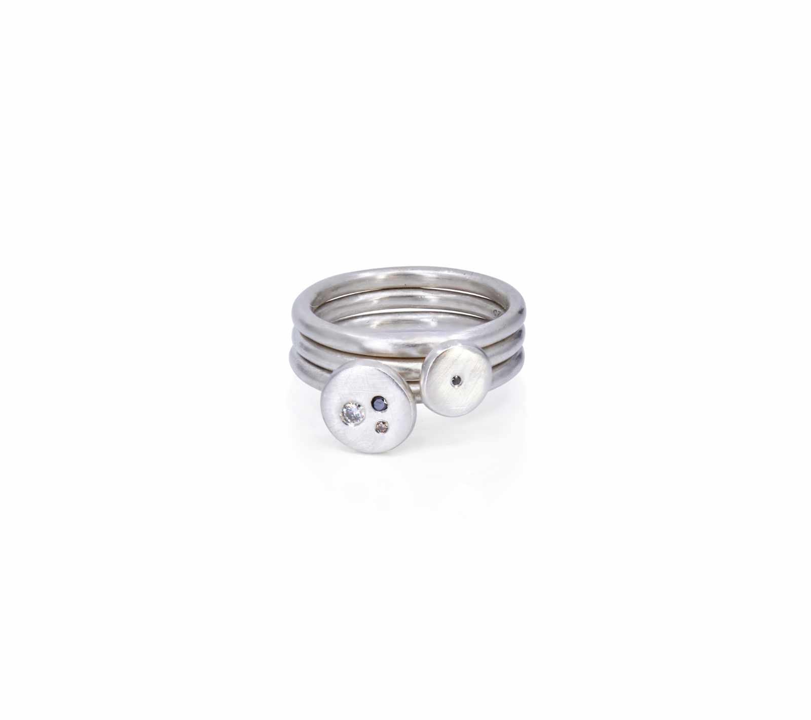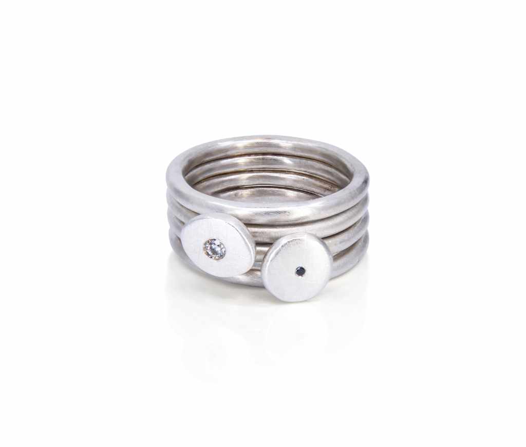 Sterling silver black & white diamond ring set [8.08mm wide at setting, 7.9mm wide at setting, 2mm round bands] [$POA]