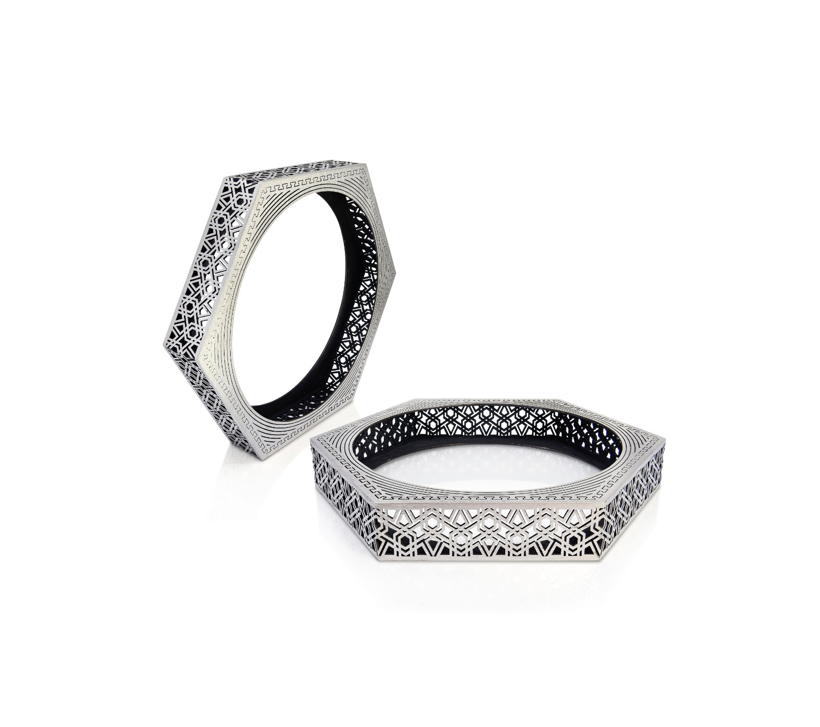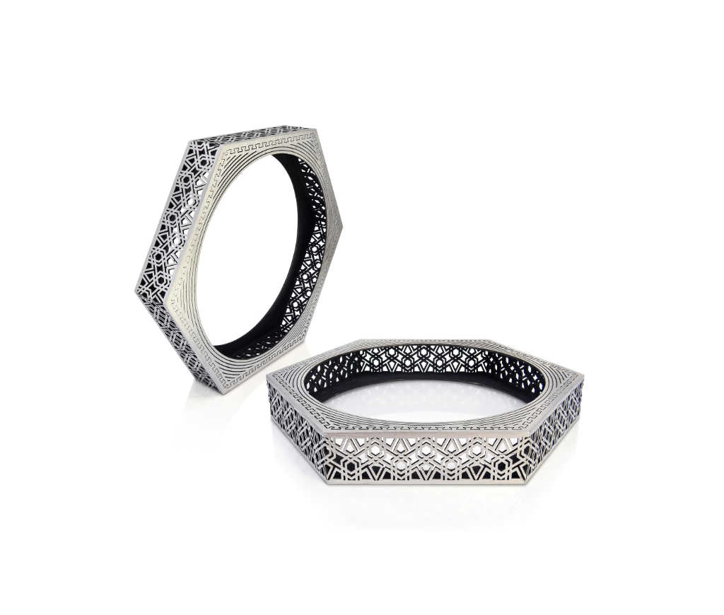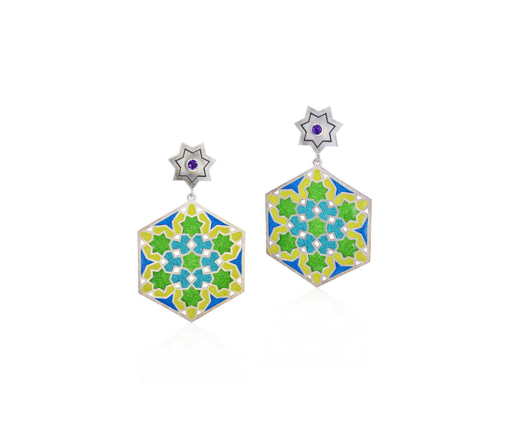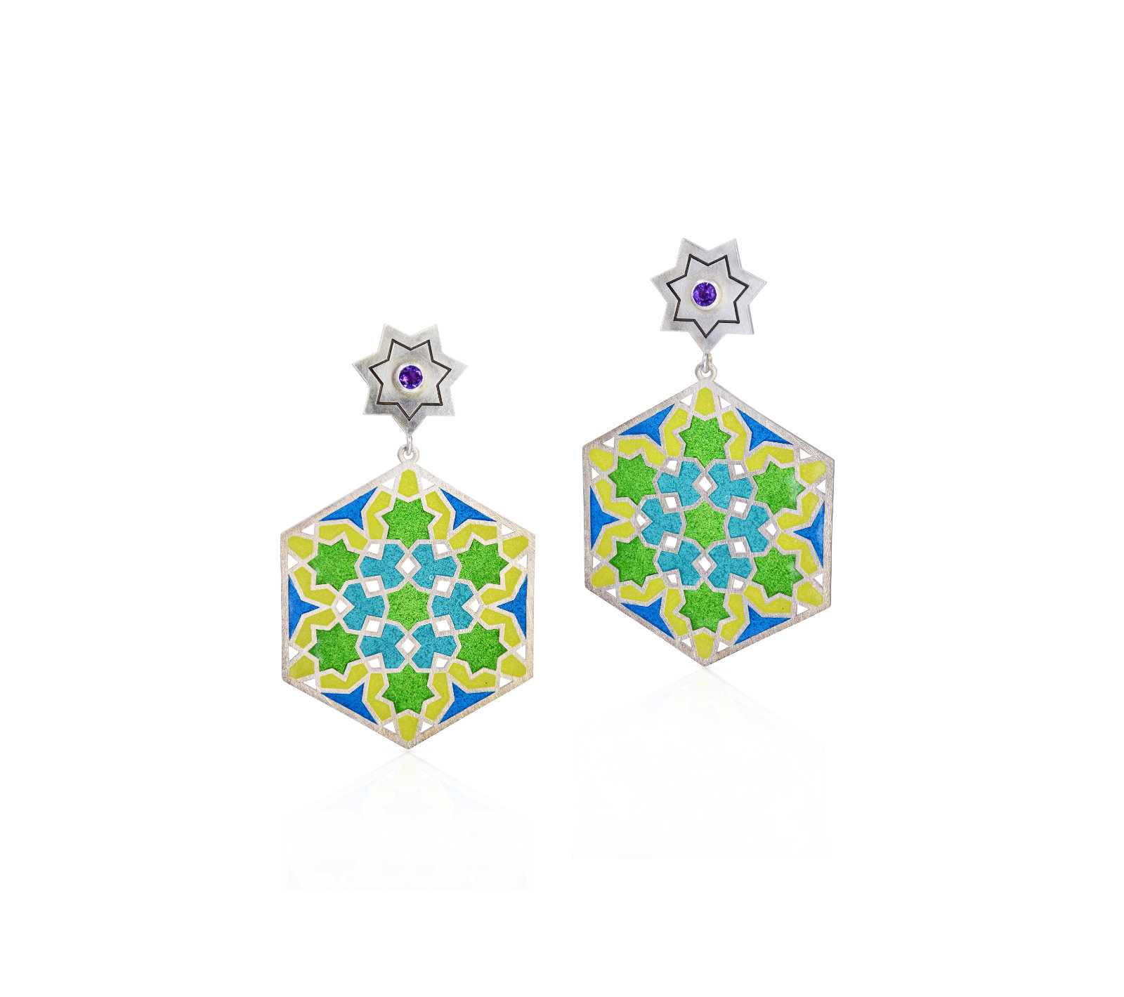 Hexagon & star earrings Sterling silver, Plique a jour vitreous enamel, lime, blue, green, garnet [58 x 34mm] [$2,150]Enquire Buy Now